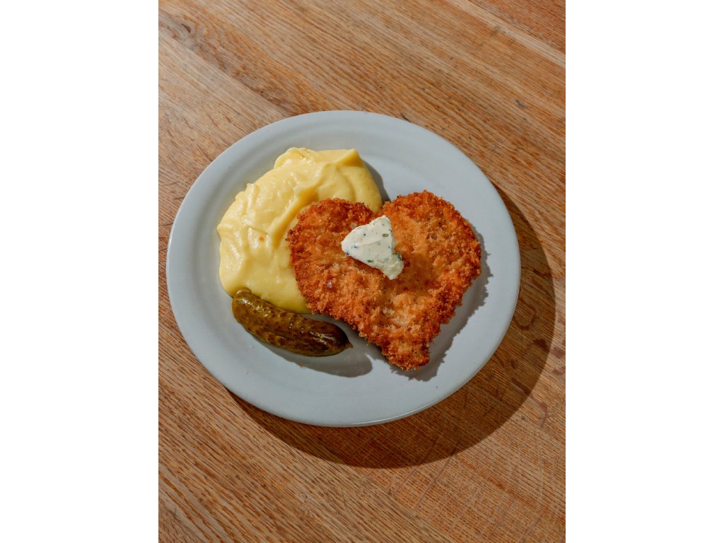Kuřecí prsa brinujeme přes noc, druhej den řízek ve tvaru srdce obalíme v trojobalu z čerstvý strouhanky a smažíme v přepuštěným másle. K řízku kaše a kyselá okurka, protože ta salátová v zimě neni....!Bylinkový máslo s citronem je nezbytnej gamechanger.