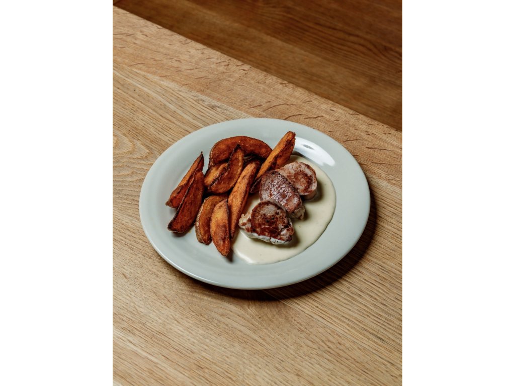 Vepřovou panenku brinujeme a druhej den na 50 stupňů zaudíme na grilu. Nakrájíme z ní medailonky a podáváme s omáčkou z gorgonzoly a smetany. Americký brambory se k tý smetanový omáčce super hodí.